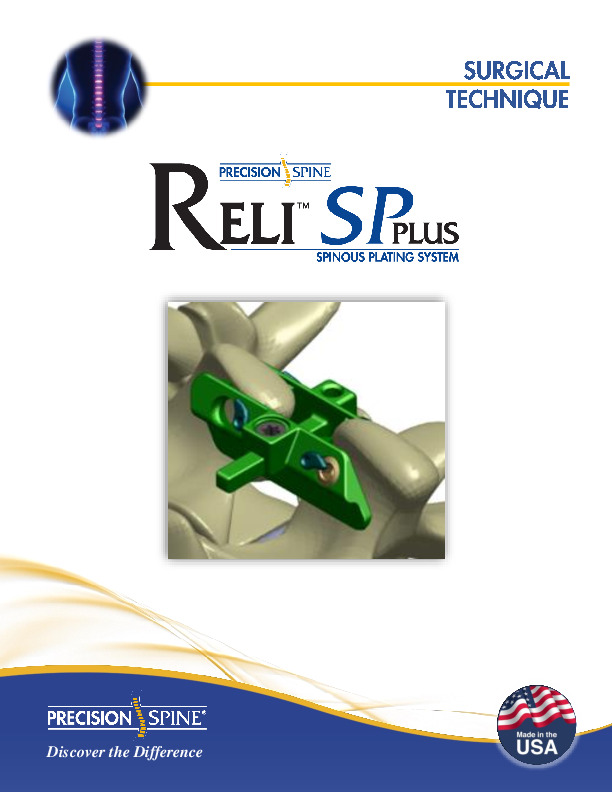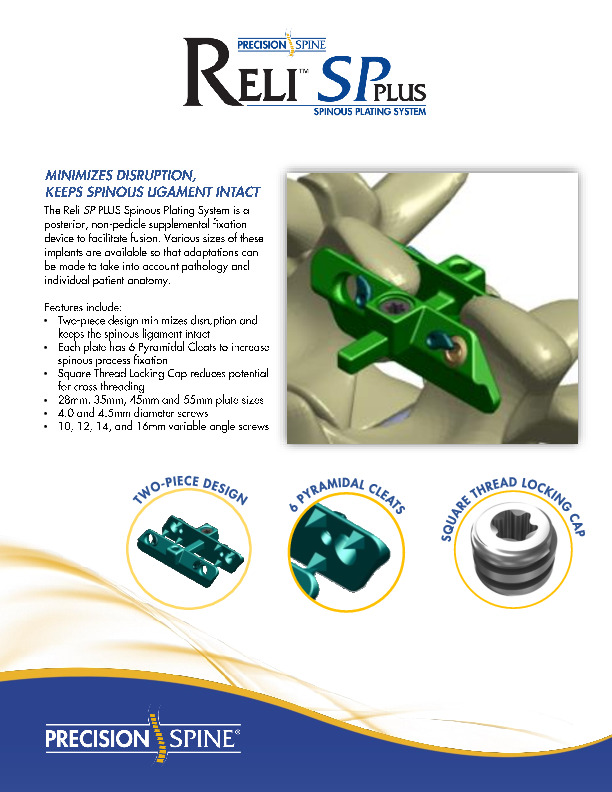 The RELI SP Plus Spinous Process Plating System by Precision Spine is a two plate spinous process fixation system with supplemental screw fixation for added rigidity and migration.