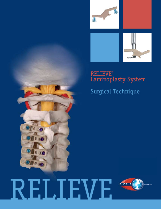 The RELIEVE posterior cervical Laminoplasty Plate by Globus Medical is an all PEEK device for use in open door laminoplasty procedures. The design allows for easy implantation with radiolucent graft allows for improved visualization on post operative imaging.