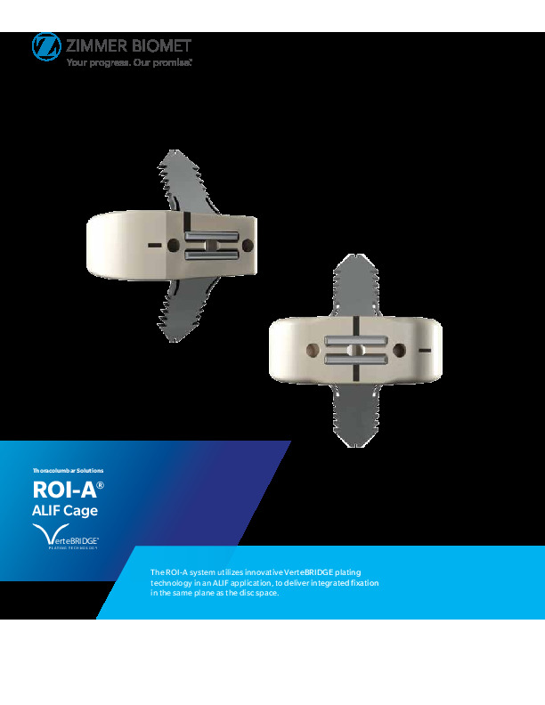 The ROI-A ALIF spacer with VerteBRIDGE technology is a standalone or with supplemental fixation for use in the Anterior or oblique lumber fusion procedure. It features a PEEK construction with locking plates.