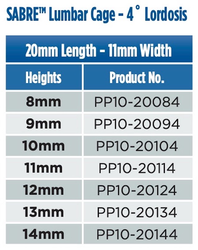 Sabre posterior lumbar interbody spacer by ChoiceSpine is made from PEEK-OPTIMA polymer with a specific size and shape that allows for use in both PLIF and TLIF procedures. Supplemental fixation required.