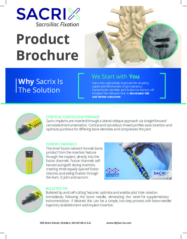 The SacroFuse by SACRIX is a subsidiary of NANASX (A venture of KIC Ventures) that provides fixation of the sacroiliac joint via a posterior-oblique approach. The SacroFuse Screw features surface treated tip and tail for increased bony on-growth. The screw features a cortico-cancellous thread with large central graft windows and fluted cutting holes for self harvesting of bone.