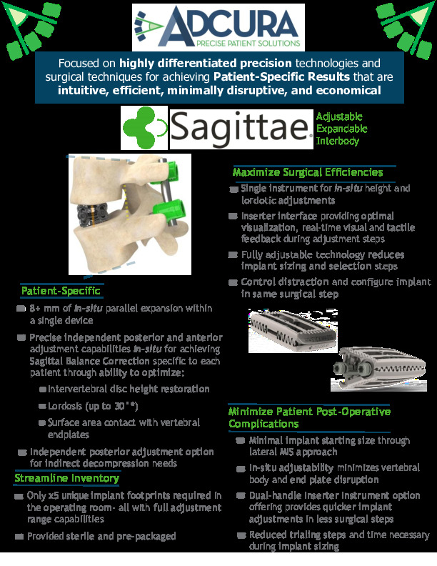 The Sagittae Adjustable Expandable Interbody by ADCURA Spine (Formerly SpineEX) is a lateral lumbar interbody spacer for use in a single or two level disc disease of the lumbar spine between L2 and S1. The Titanium device is made with two drive shafts to independently adjust the height of the anterior and posterior heights and thereby height and lordosis.