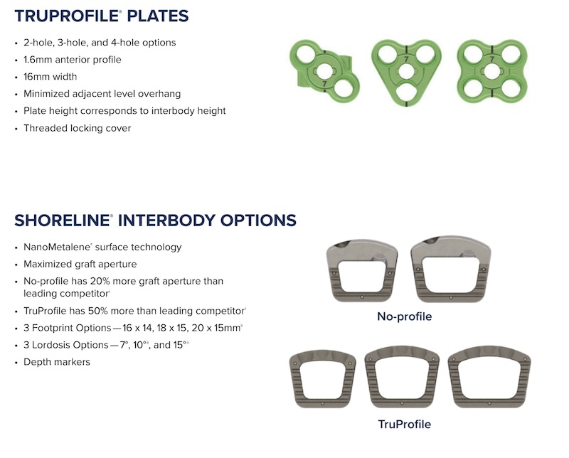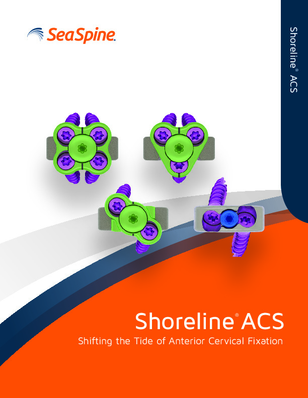 The Shorline ACS is an ACDF spacer with multiple profile options for fixation including an integrated zero-profile fixation and a low profile plate option with 2, 3, or 4 screw hole plate options. The plates compress on to the Titanium coated PEEK spacer (Nanometalene) to increase bony ingrowth and increase fusion rates. The low profile and integrated plates allow for decreased adjacent segment disease.