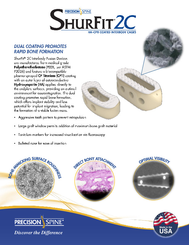 The ShurFit 2C Curved TLIF Spacer by Precision Spine is a PEEK interbody spacer with a dual coating of plasma-sprayed Titanium with an outer layer of Hydroxyapatite coating as well. The dual coating allows rapid bony integration. It is for use in the TLIF approach and intended for insertion into the anterior disc space
