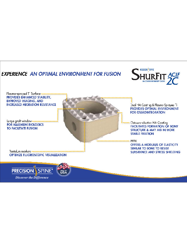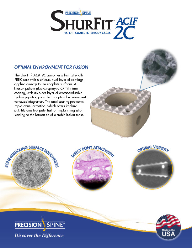 The ShurFit PEEK and ShurFit ACIF 2C by Precision Spine are PEEK interbody spacers for use in the ACDF procedure and come in standard PEEK as well as the 2C which comes with a dual layer of Plasma-sprayed Titanium coating and hydroxyapatite coating as well to improve osseointegration. This dual coating allows for increased visualization with the PEEK body and allows for increased bony integration due to the roughness of the Ti plasma spray coating.