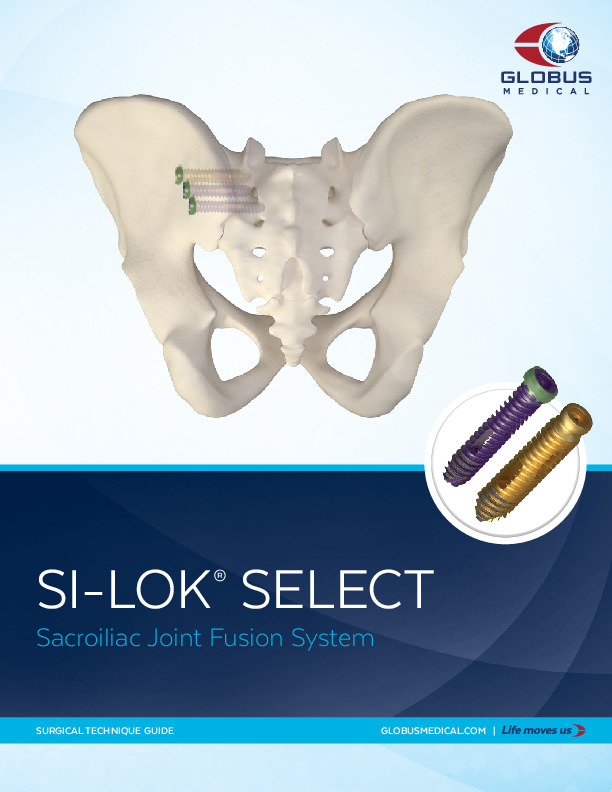 The SI LOK SELECT by Globus Medical is a Sacroiliac Joint fusion system that can be used in both posterior and MIS lateral SI Joint fusion procedures. The SI LOK SELECT differs from SI LOK in that it is a SintrOS laser etched titanium surface for increased bony on-growth, whereas the SI LOK is hydroxyapatite coated. Can be utilized with a washer for increased compression.