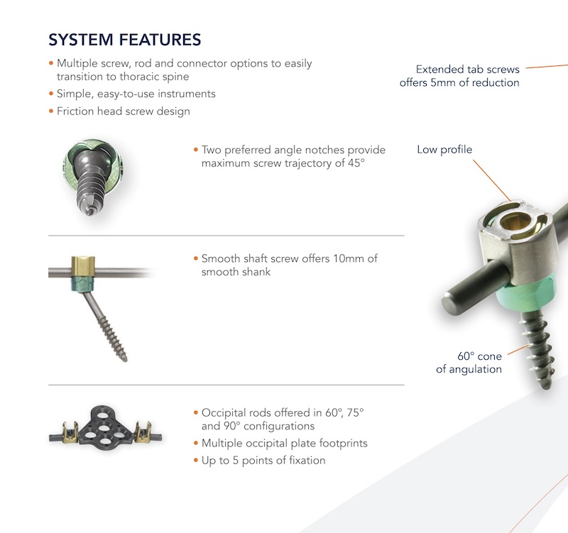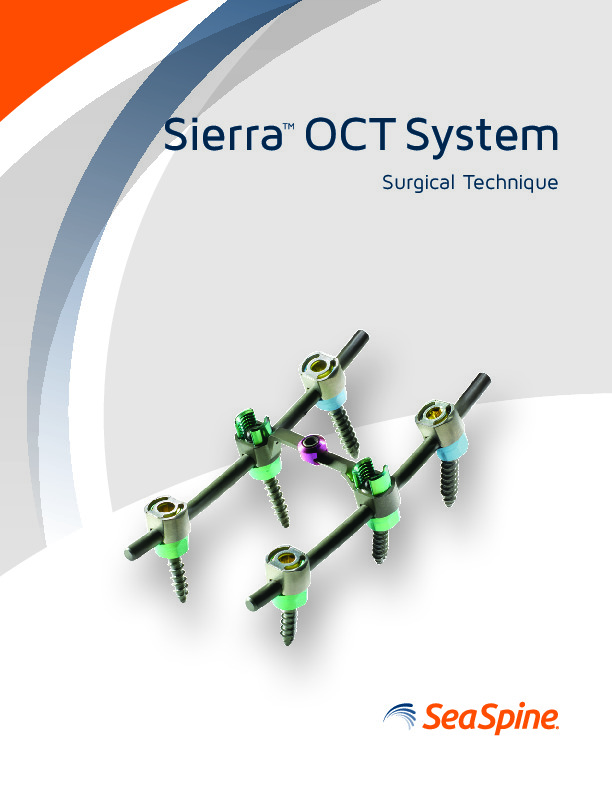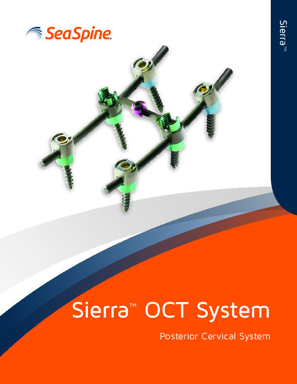 The Sierra OCT is a posterior Occipital Cervical Thoracic fusion system by SeaSpine offers an occipital plate with 5 points of fixation and articulating tulip heads.