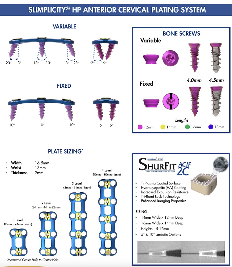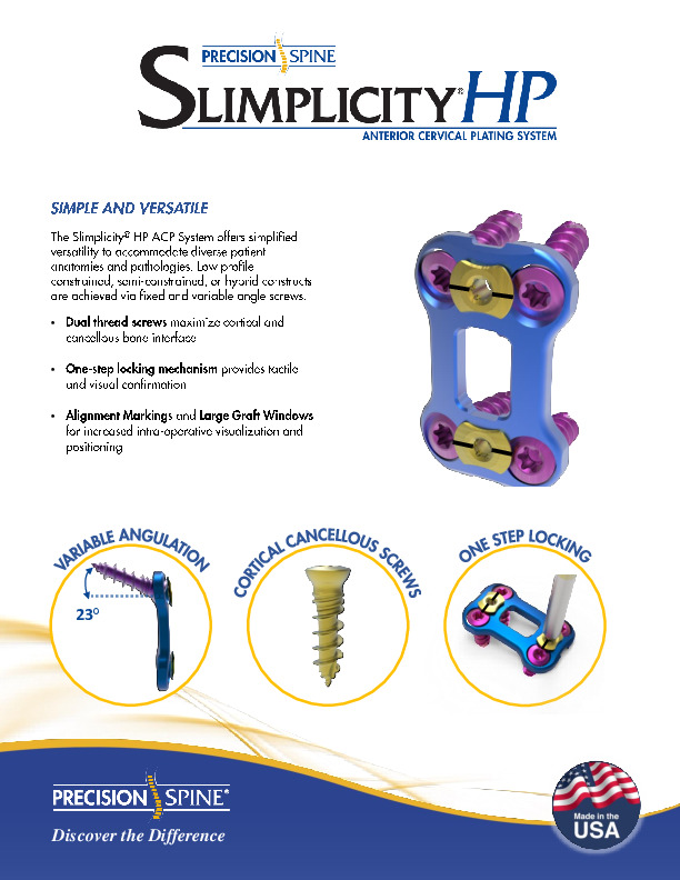 The Simplicity HP Anterior Cervical Plate by Precision Spine is a stand alone plate with high angulation of screws at the superior and inferior end of the plate. The plate features a locking screw cam to prevent back out and is available in 1 to 4 level plates