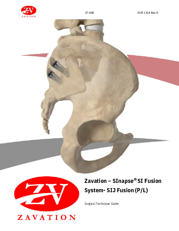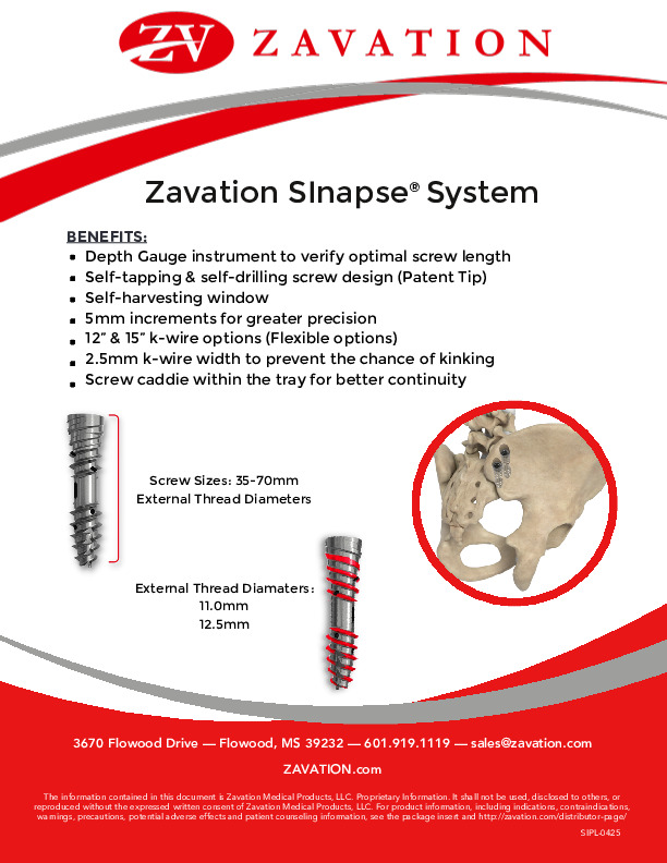 The SInapse SI joint Fusion System by Zavation is a MIS approach for SI joint fixation. It is titanium screw with cannulated and self-harvesting graft fenestrations.