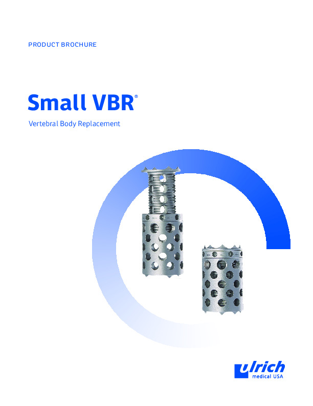The Small VBR expandable vertebral body replacement by Ulrich Medical USA is used for the surgical reconstruction of the spine after vertebrectomy in the cervical, thoracic, and lumbar spine. It is a titanium alloy expandable device that utilizes gear driven stepless expansion in situ for ease of placement and bridging of the defect, with a locking screw for final fixation. Intended to be used with supplemental fixation.