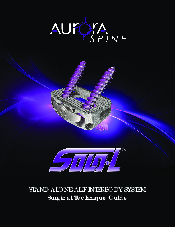 The SOLO-L Stand-Alone ALIF Cage by Aurora Spine is a 3D printed porous titanium spacer inteded for user in fixation of the anterior lumbar intterbody procedure. It features 4 integrated screw fixation with an anterior plate