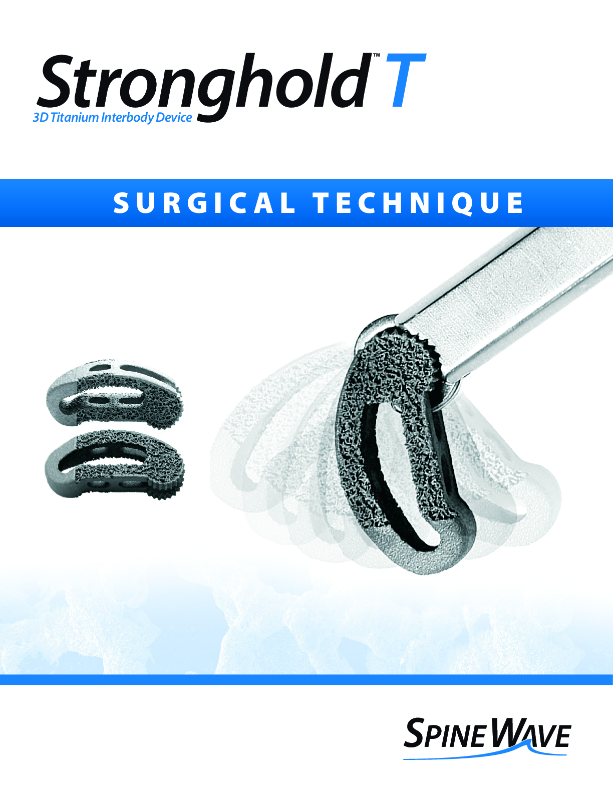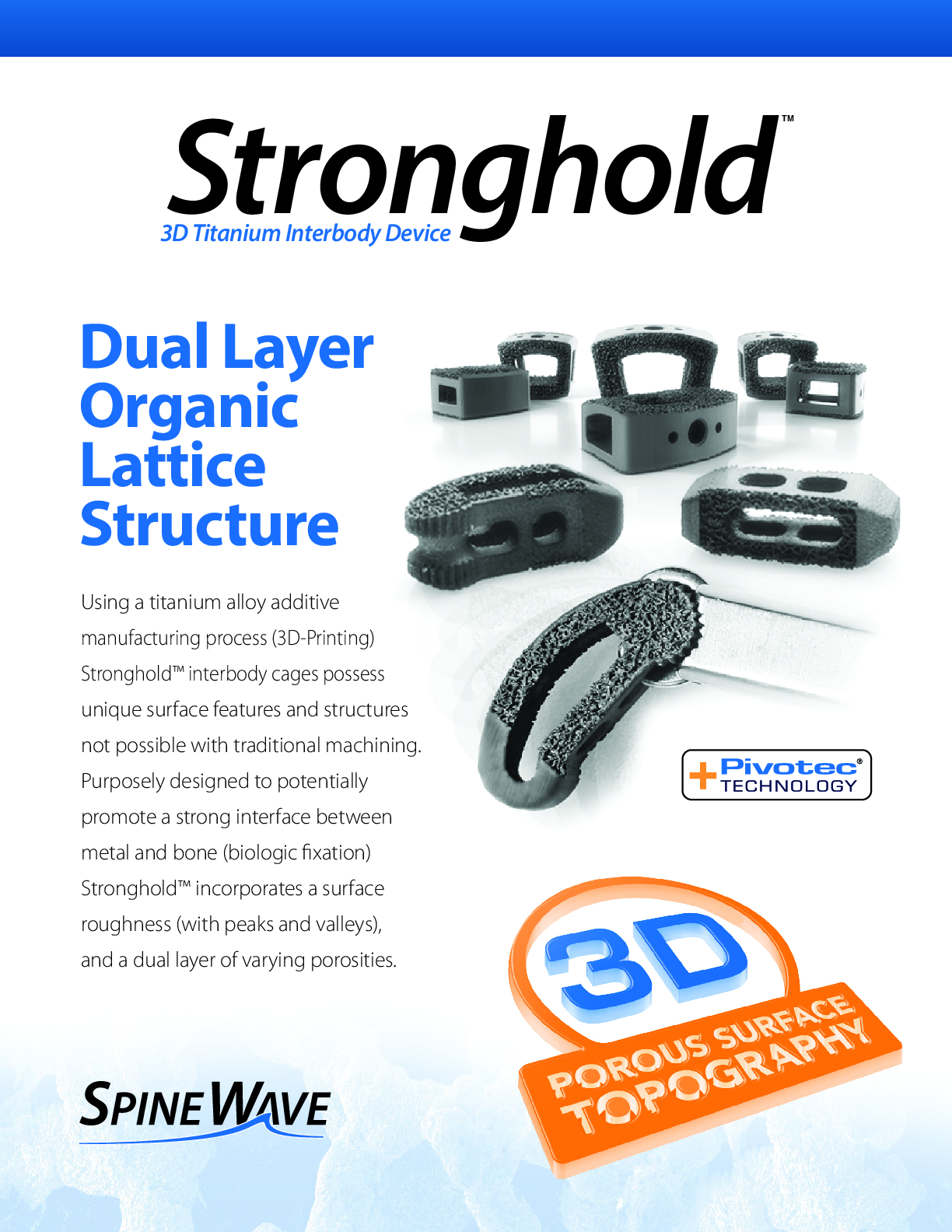 Stronghold T by Spine Wave is a 3D printed titanium transforaminal lumbar interbody device. It is made using TiCell 3D advanced surface technology which is characterized by a dual layer lattice design with optimally sized interconnected pores and surface roughness. The open architecture allows for large amounts of bone graft as well as implant visualization and fusion assessment on post-operative imaging. It also features Pivotec technology for articulating cage delivery via a small TLIF approach.