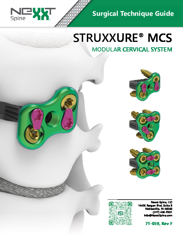 The STRUXXURE MCS (Modular Cervical System) by Nexxt Spine is a modular anterior cervical plating system that can be used alone as a low profile plate or assembled prior to implantation as a conjoined construct. STRUXXURE MCS is compatible with Nexxt MATRIXX cervical interbody or PEEK interbody.