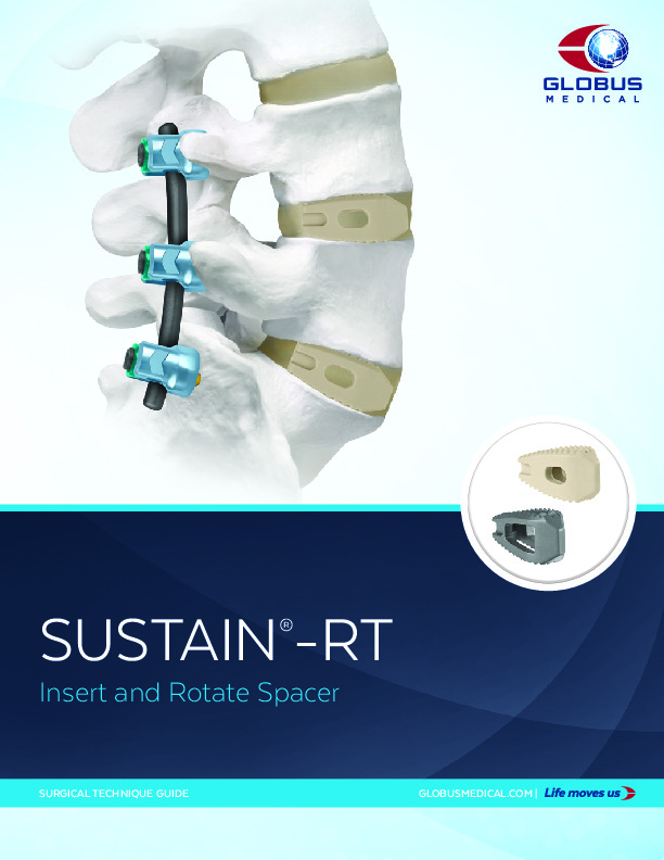 The SUSTAIN -RT is a TLIF and PLIF lumbar interbody spacer by Globus Medical. It is available in both titanium and PEEK. The SUSTAIN -RT is an insert and rotate interbody spacer for use in the lumbar spine. The titanium spacer has etched surface for enhanced bony on-growth and faster integration.