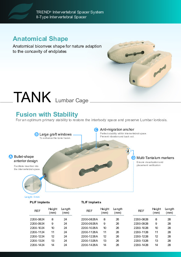 The TANK PEEK TLIF and PLIF Spacer by Biomech Spine is a biconvex anatomic shape PEEK Spacer for use bilaterally in the PLIF procedure or singlely in the oblique TLIF approach.