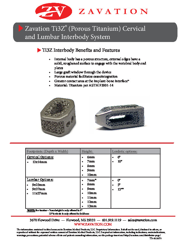 The Ti3Z Cervical ACDF spacer by Zavation is a 3D printed titanium spacer with an open porous architecture and a large central window for graft.