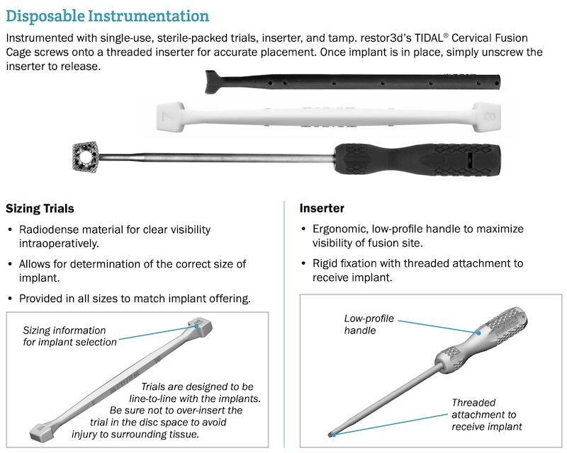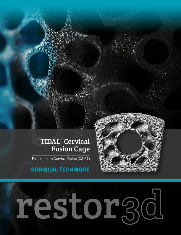 The TIDAL Cervical Fusion Cage by Pressio Spine (formerly distributed by Restor3D and sold in 2024) is a 3D printed titanium ACDF spacer that features porous TIDAL technology that allows bony ingrowth. The 3D printed surface and porous nature allow cellular attachment. The system includes disposable single-use sterile packed trials and inserter