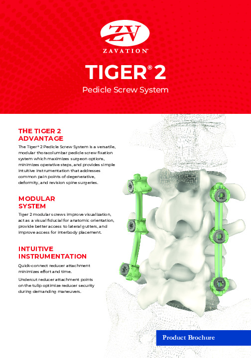 The Tiger 2 is a modular pedicle screw fixation system for use in the thoracolumbar-pelvic spine. Tiger 2 is a complete system that features a full complement of screw options including cannulated and fenestrated screws as well as iliac screws. The system accepts Bothe 5.5 and 6.0mm rods.