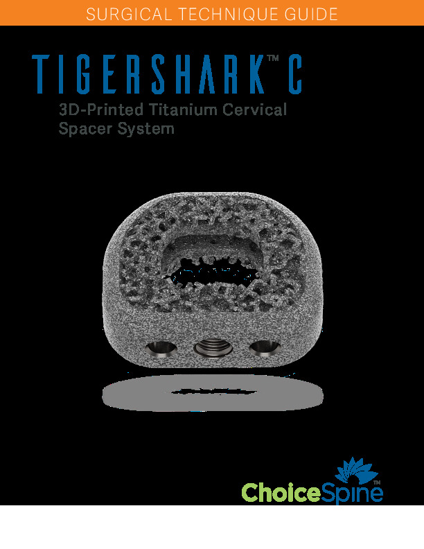 The TigerShark C by Choice Spine is a 3D printed titanium ACDF spacer utilizing Choice Spines proprietary porous trabecular metal technology. The spacer has a large central window and requires supplemental fixation with several options.