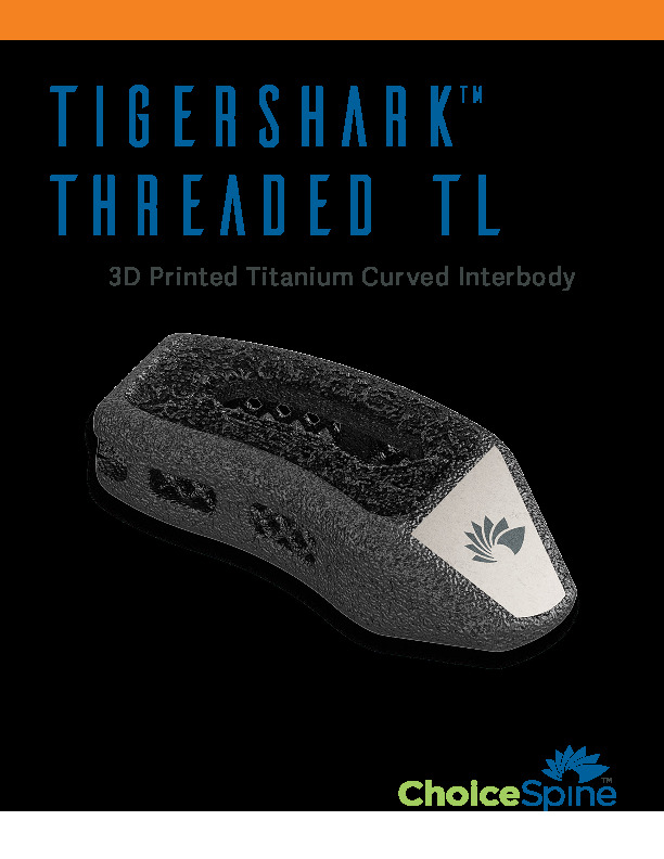 The TIGERSHARK Threaded TL is a 3D printed porous titanium curved interbody spacer for use in the TLIF procedure. It features BioBond technology producing porous trabecular titanium structure which allows for bony ingrowth. It features a tapered nose for easy insertion.