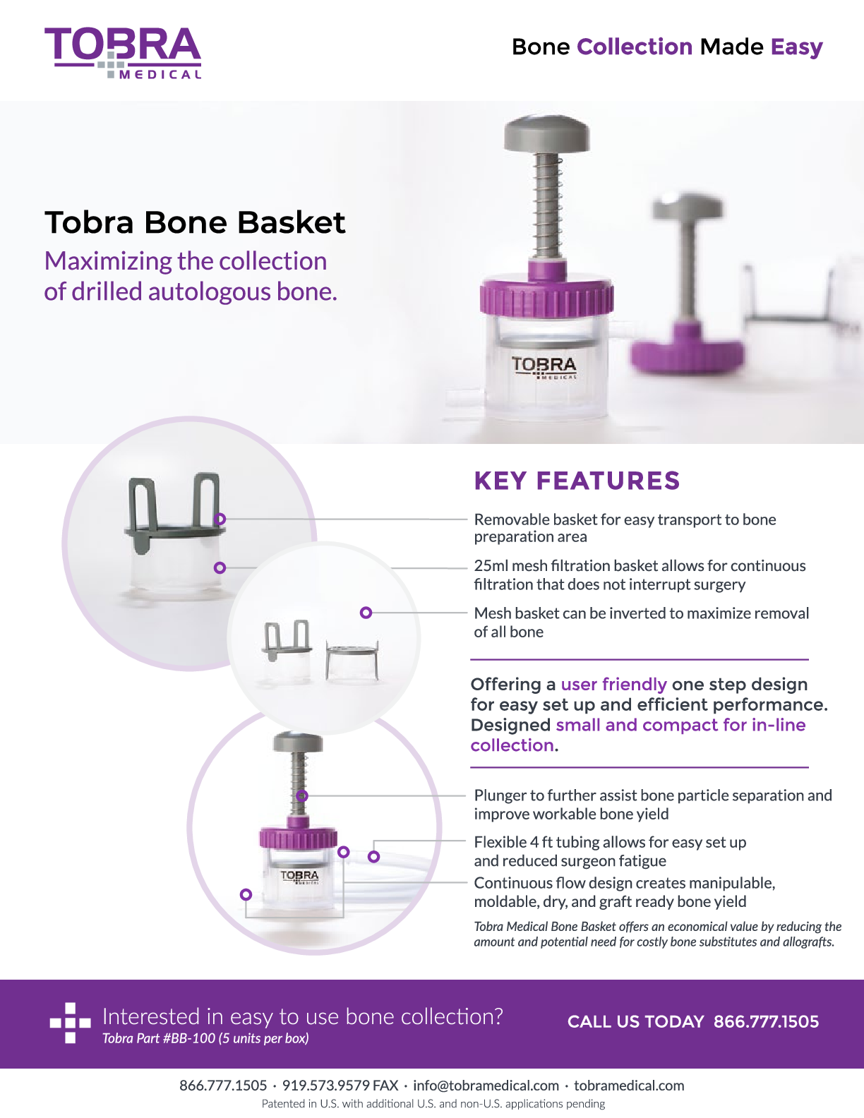 The Tobra Bone Basket by Tobra Medical is an autologous bone dust collection device that features a removable 25mL filtration basket, a plunger to further assist bone particle separation, and 4ft of flexible tubing for ease of set up and reduces surgeon fatigue. The mesh basket separates the drilled and suctioned bone particles from other fluids and collects and contains the bone particles which can then be used as autologous bone graft material.