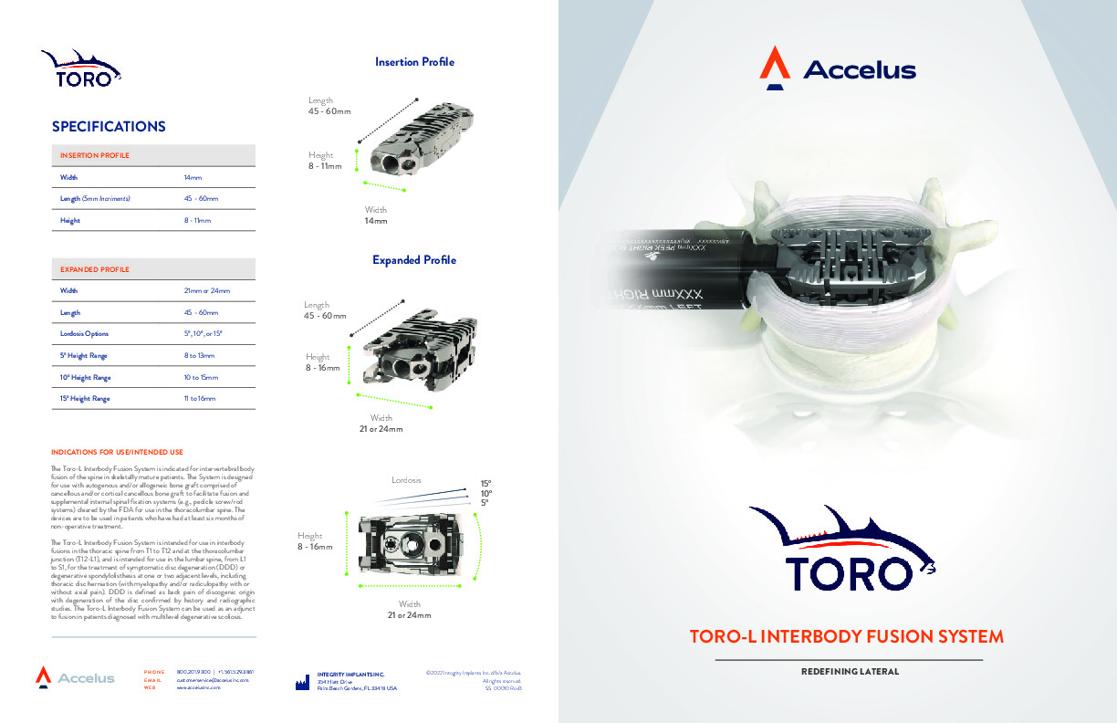 The TORO-L is a novel bi-planar expandable lateral implant for use in the direct lateral approach. It features an all titanium construction and inserts as a small 10x14mm insertion size and is capable of expansion in the Anterior-posterior direction as well as height expansion and can be locked in at the preferred height.