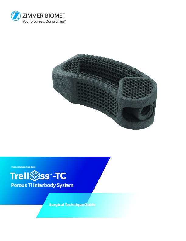 The TrellOss-TC by Highridge Medical is a 3D printed porous titanium spacer for use in the TLIF procedure and features a 70% porous architecture. TrellOss-TC was initially sold by Zimmer-Biomet before being spun off as ZimVie and acquired by Highridge in 2024.