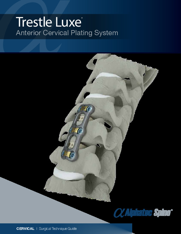 The Trestle Luxe plate is an anterior cervical plate system that is intended for use in the ACDF procedure and available size options for 1-3 levels with 4 and 5 level options available on demand. Differences between this and the Luxe II plate is that Luxe II has a temporary pin site above and below for easier placement of screws. The Trestle Luxe has less cranial/caudal screw angulation at 9 degrees where Luxe II has 28 degrees.