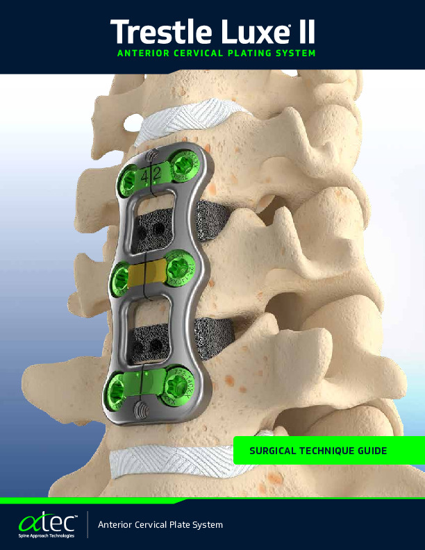 The Trestle Luxe II Anterior Cervical Plating System by Atec is an anterior cervical plate designed for the ACDF procedure that features a self-locking screw mechanism. Block slider automatically covers and prevents blackout of screw once inserted. Comes with tool for screw removal if needed