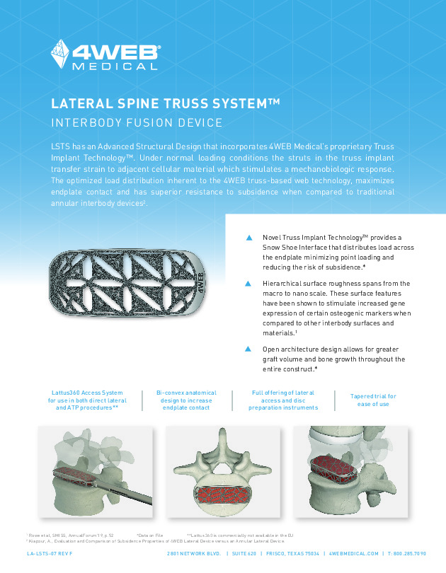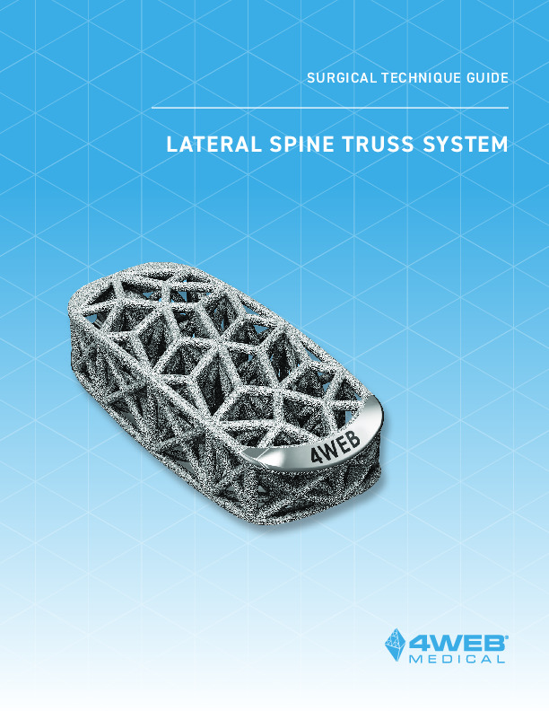 The Lateral Spine Truss Interbody Spacer by 4WEB is an open architecture 3D printed titanium cage with bi-convex endplates for use in the direct lateral approach and the Anterior-To-Psoas approach. The open nature of the graft allows load distribution thereby decreasing the risk for subsidence.