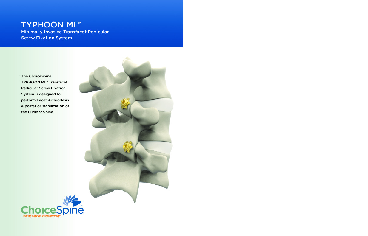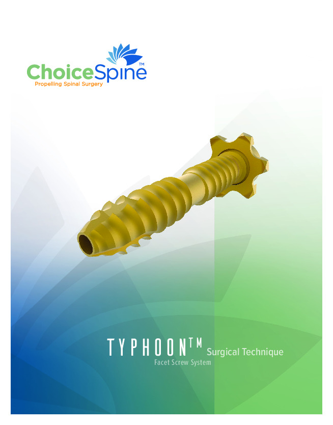 The TYPHOON Facet Screw System by Choice Spine is a minimally invasive posterior Trans-facet Pedicular screw intended for fixation across the thoracolumbar and sacral facet joints. It features a cannulated lag screw with dual pitch threads and a washer for added fixation and load distribution across the facet joint.