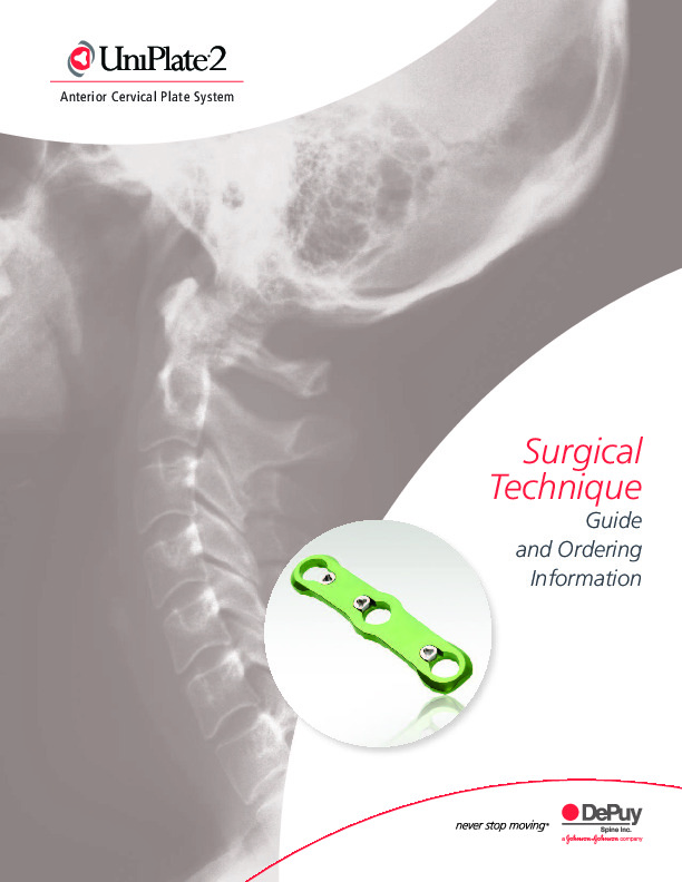 The UNIPLATE 2 Anterior Cervical Plate System by Depuy-Synthes J&J Medtech is a low profile, small footprint narrow midline anterior plate for supplemental fixation in the ACDF procedure. It features a locking screw cam that uses a tri-lobe driver and 30 degree screw angulation. UNIPLATE 2 is the two level version of the UNIPLATE.