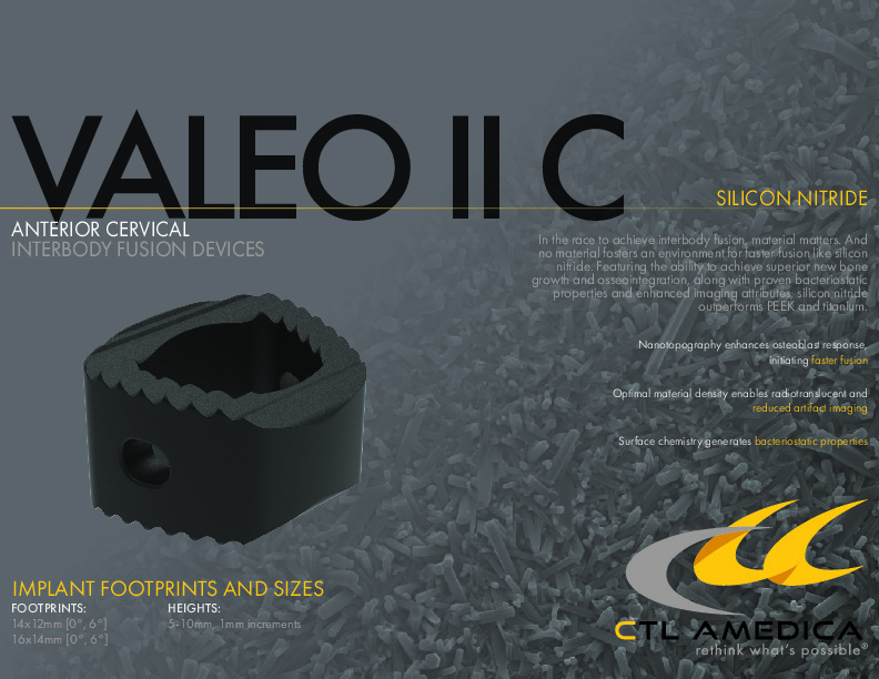 The VALEO II C by CTL Amedica is a Silicon Nitride based spacer for use in the ACDF procedure of the cervical spine. This material along with being radiolucent is shown to be osseointegrative and bacteriostatic.