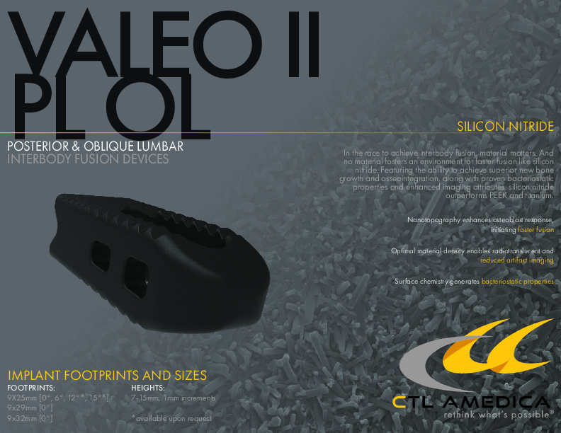 The VALEO II PL/OL Posterior Lumbar and Oblique Lumbar by CTL Amedica is a Silicon Nitride space for use in the PLIF approach bilaterally or the TLIF approach obliquely. The Silicon Nitride is radiolucent and hydrophilic with bacteriostatic properties.