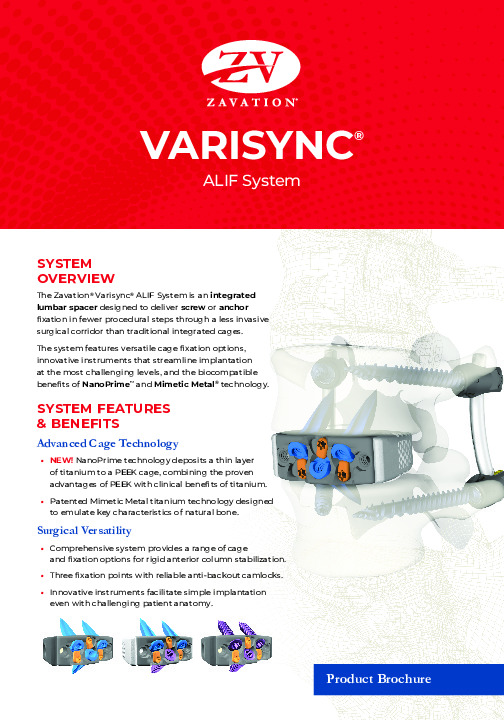 The Varisync ALIF System by Zavation is a stand alone Anterior lumbar interbody spacer designed with a modular plate and spacer. The fixation is achieved through either use of traditional screw fixation or anchor fixation. The spacers are available as the F3D-Z 3D printed titanium or NanoPrime titanium coated PEEK. The Plate and cage slide together pre-insertion.