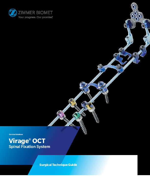 The Virage OCT Occipital-cervical-Thoracic Posterior fixation system was originally sold under Zimmer-Biomet now sold under Highridge Medical is a complete posterior system. This features high-angle omni-directional screw that allows up to 56 degrees of angulation in one direction or 112 degrees in conical angulation total. It features a complete set of Occipital plates, transition rods, hooks, rod connectors etc.