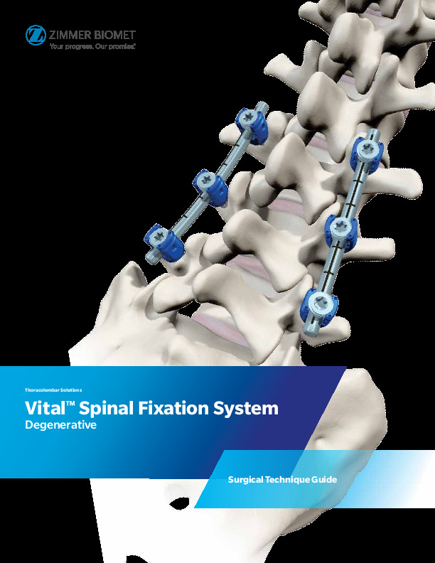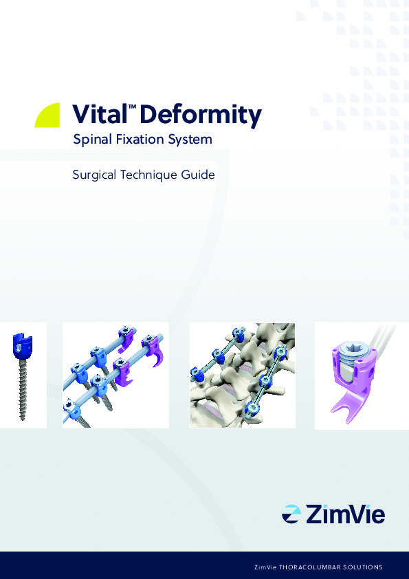 The Vital Deformity Fixation System is by Highridge Medical (originally sold under Zimmer-Biomet, now ZimVie) is a comprehensive system for use in the simple degenerative cases, trauma, and complex deformity with need for de-rotation. System for use with the 5.5 and 6.0mm rod.