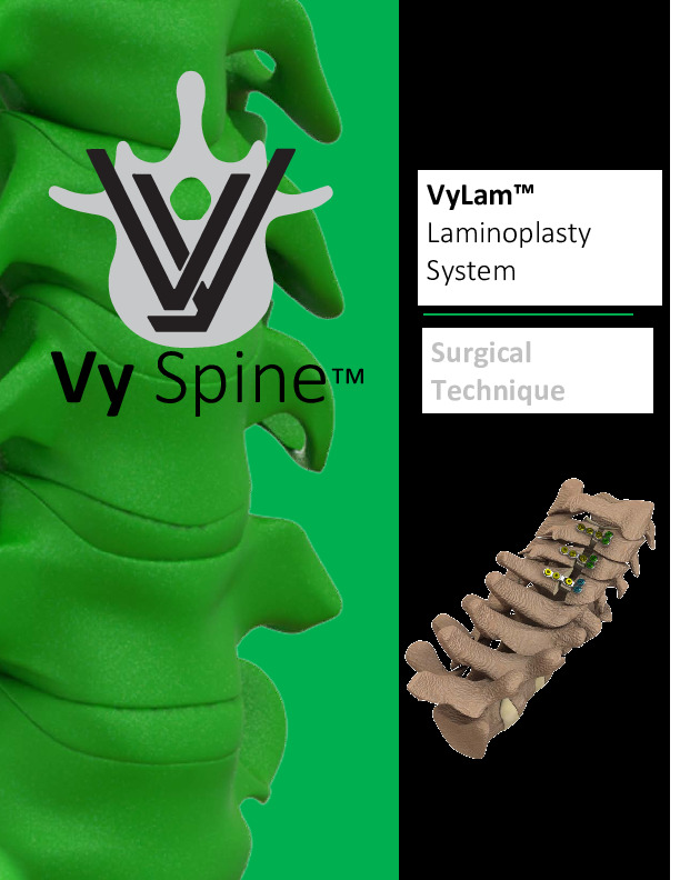 VyLam laminoplasty system by VySpine contains plates and screws in a variety of sizes and configurations fabricated from titanium alloy and indicated for use in laminoplasty of the lower cervical and upper thoracic spine. Plates are offered in 3-14 mm opening sizes and are available in five different designs: standard, single hook, double hook, inline double hook, and support hinge. Screw lengths range from 4-12 mm with diameters of 2.0 and 2.4 mm, in both self-taping and self-drilling options.