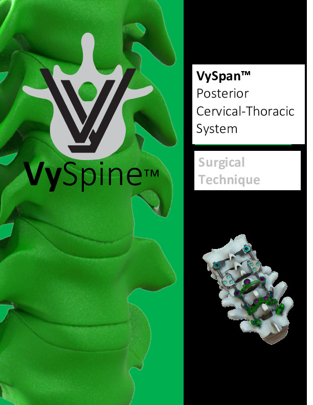 VySpan PCT system by VySpine is a posterior cervical thoracic fixation system intended for posterior fusion of the cervicothoracic spine. It has a variety of vertebral anchor devices, featuring hooks, standard thread and smooth-shank screws, and poly-axial and fixed angle heads both with reduction head options. Rods are available in multiple lengths both curved and straight, with connectors and transition rod options to connect to thoracolumbar implants. Multiple versatile cross-links are available including head-to-head and rod-to-rod, both with double and single joint configurations. The poly-axial screws have a high degree or rotational freedom as well as an internal collet for superior locking strength.