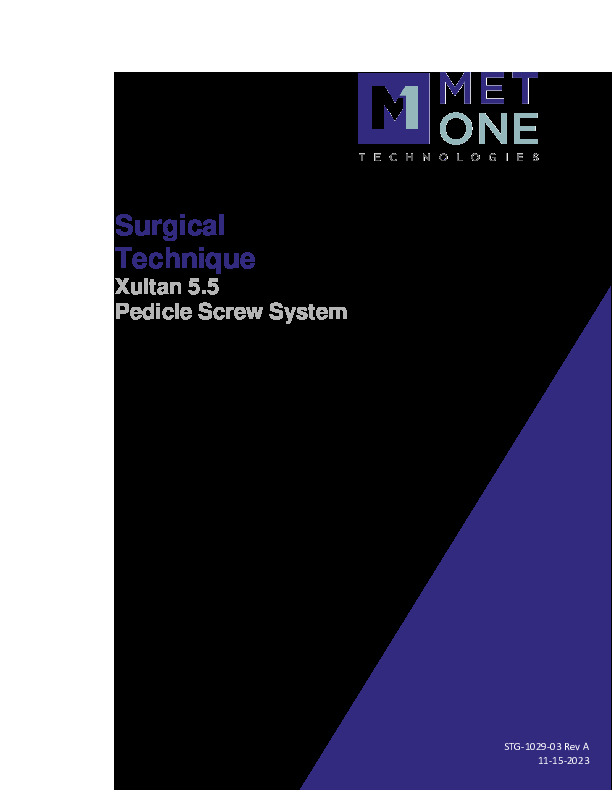 Xultan 5.5 Pedicle Screw System by Met One Technologies includes multiple screw, rod, and crosslink options for posterior stabilization of the thoracolumbar spine. The screws available include polyaxial, solid, cannulated, and reduction options with double-lead thread to help speed insertion and a unique cortical-cancellous thread design to better match the cortical bone of the pedicle and cancellous bone of the vertebral body. Polyaxial screws have up to 70 degrees of conical angulation. Ergo-dynamic-quality instrumentation is designed to reduce length of time needed for insertion. The set screws have a reverse-angle thread to helps prevent head splay, and the tulip resists movement due to Silicone O-Ring Technology.