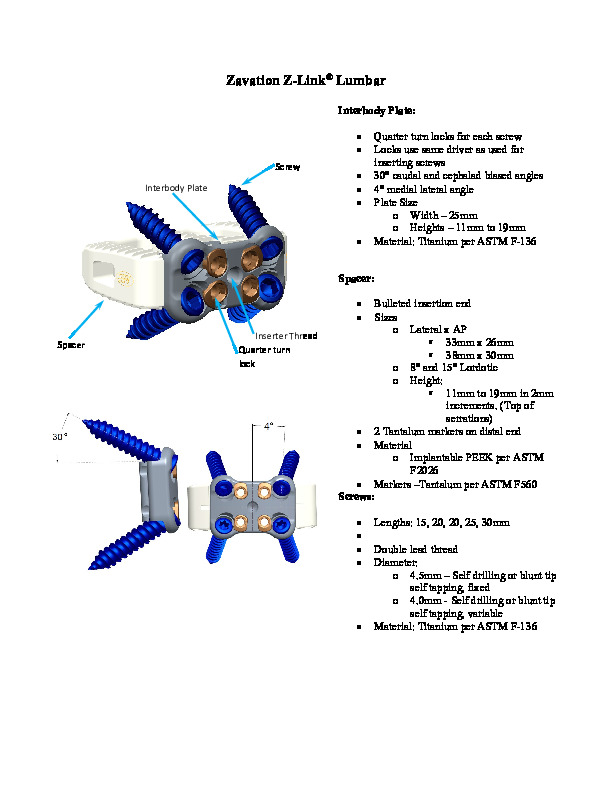 The Z-Link Lumbar is a stand alone ALIF spacer with connected modular plate. This allows for appropriate size plate and spacer combination for optimal fixation to the vertebrae. Spacer is PEEK with titanium anterior plate