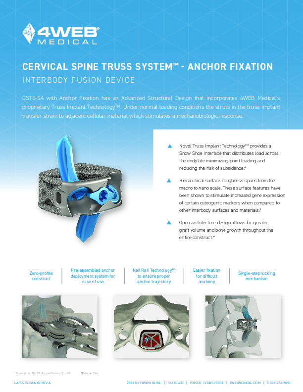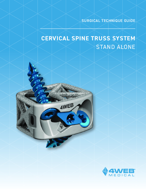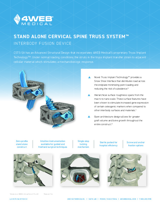 The Cervical Spine Truss System - Stand Alone ASTS-SA is an open architecture 3D printed titanium spacer with titanium plasma sprayed coating and features a zero-profile integrated screw fixation.