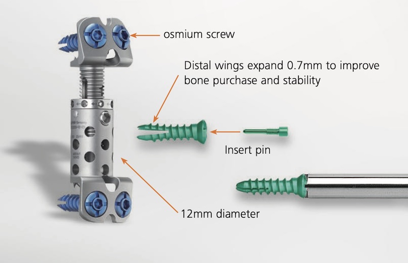 ADDplus by Ulrich Medical USA is a titanium alloy expandable vertebral body replacement implant used for surgical reconstruction of defects of the anterior thoracolumbar spine T1-L5. It is designed with integrated low profile superior and inferior plates for increased stability, and anchored with unique osmium screw technology to provide optimal stabilization. The distal wings of the screw expand 0.7 mm to improve bone purchase and stability once the pin is inserted. Continuous frictionless expansion in situ uses gear driven technology, allowing for easy placement and bridging of the defect. Intended for use with supplemental fixation.