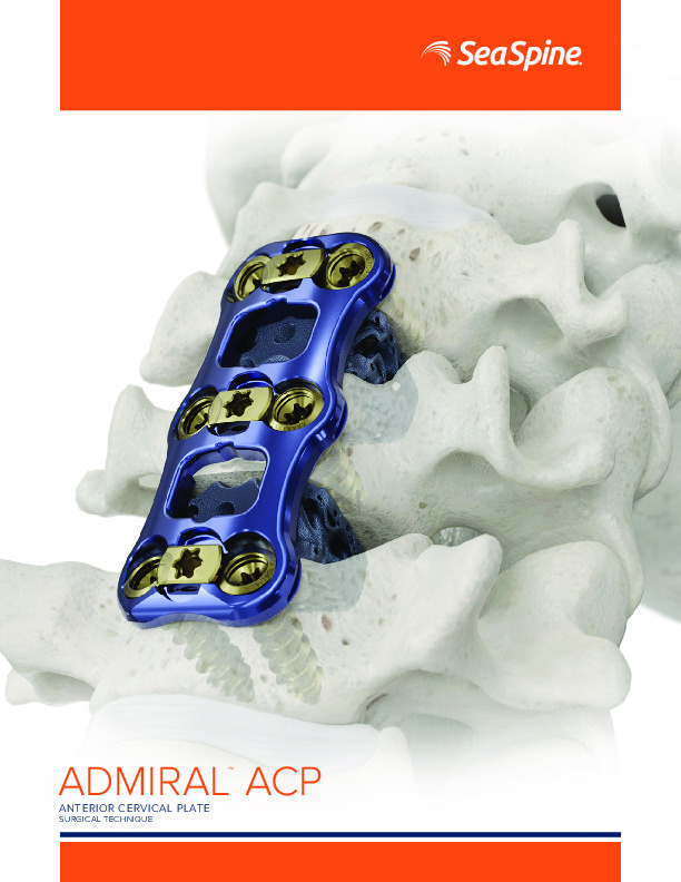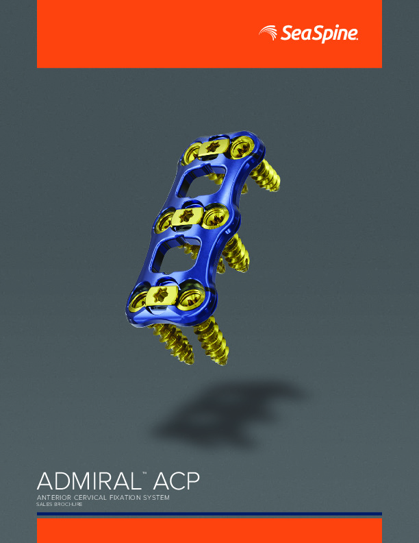 The Admiral ACP Anterior Cervical Plating system is a thin profile ACDF plate that covers single level to 5 levels. Comes as 2.3mm thick in the one and two level plates and the remainder at 2.5mm thick. Torx screw has integrated screw blocking to prevent blackout.