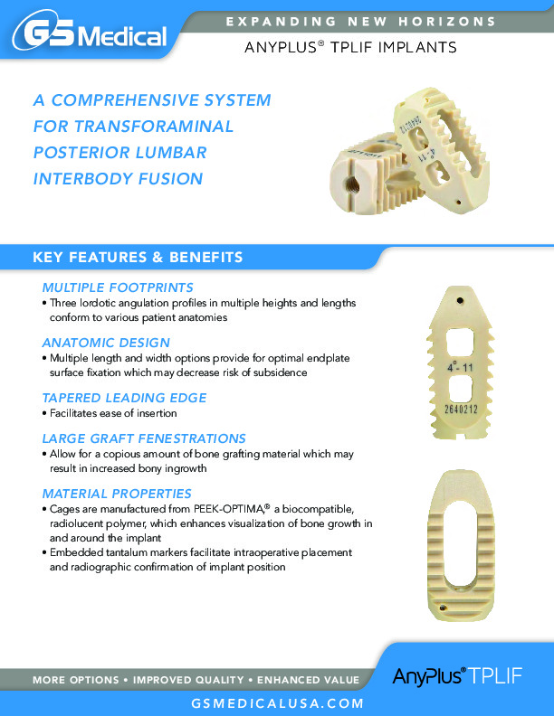 The AnyPlus TPLIF Implant system by GS Medical is a PEEK straight lumbar interbody implant for use in the bilateral PLIF or the oblique TLIF procedure. It features a radiolucent PEEK material with a bullet nose for easy insertion.