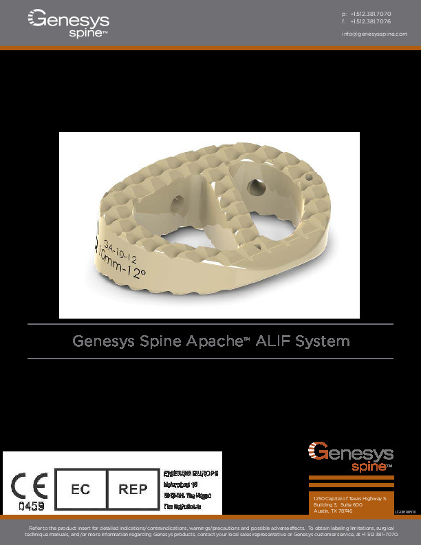 The Apache PEEK ALIF Spacer by Genesys Spine is indended for anterior or anterio-lateral interbody fixation of the lumbar spine.