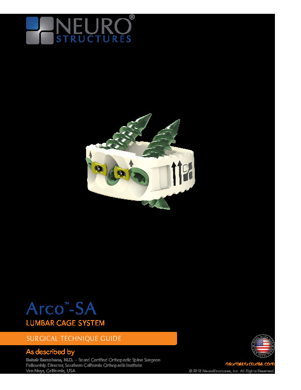 Arco-SA is a standalone zero-profile ALIF implant by NeuroStructures/NuGen that comes in anatomically shaped PEEK or porous titanium. The cage is designed with a large single central graft chamber as well as lateral side windows for additional bone growth in the axial plane, and the porous titanium is excellent at promoting long-term fixation with bone ingrowth. It is available in multiple footprints, lordosis, and heights, with three screw fixation each with variable angulation options and a simple active locking mechanism.