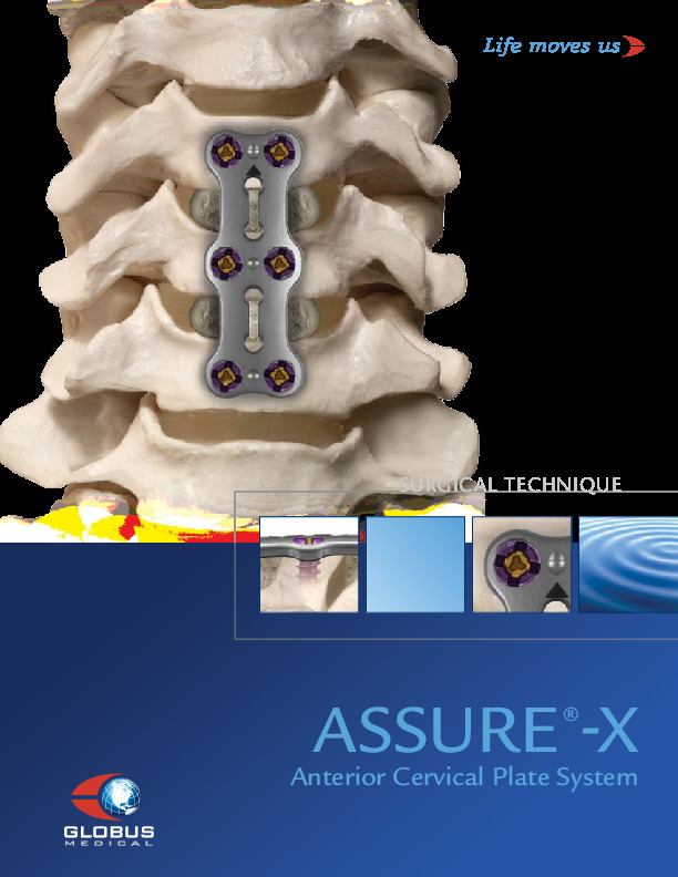 The ASSURE -X Anterior Cervical Plating System by Globus Medical is an anterior cervical plate for use in the ACDF procedure as supplemental fixation. Comes as single level up to 4 level plate. Similar to the ASSURE plate but with high degree angulation of the cranial and caudal screws up to 18 degrees.