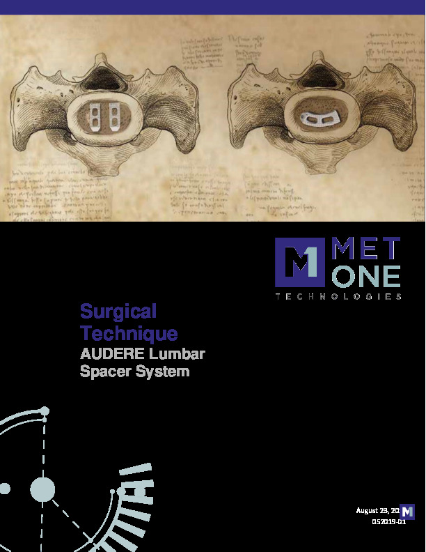 Audere TL by Met One Technologies is a curved transforaminal lumbar interbody spacer made of PEEK with radiographic tantalum markers. It has a bullet-shaped nose, large graft windows, and textured superior/inferior surfaces. Quick-release inserter prevents cage cross threading and allows for easier implant insertions. Multiple sizes and lordosis options.