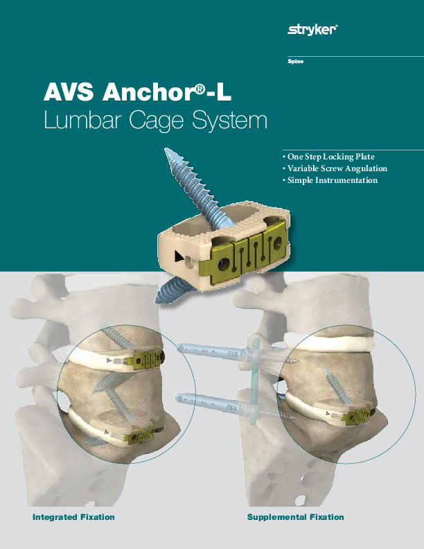 The AVS Anchor-L is a PEEK Anterior Lumbar Interbody spacer by Stryker for use in the ALIF procedure. If features integrated screws and is suitable for standalone fusions. It features a locking anterior plate to prevent screw migration